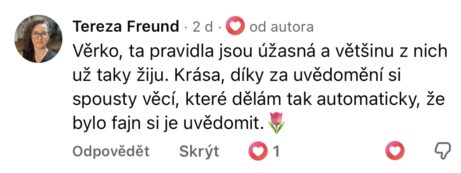 Než jsem vstoupila k Věrce, věděla jsem, že jsem v dobrých rukou. Že za sebou nechávám kus cesty. Ale že fakt najdu sebe, že ujdu tak daleko a přitom do hloubky, to jsem nevěděla... Navždycky už ti budu vděčná.