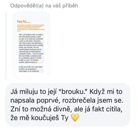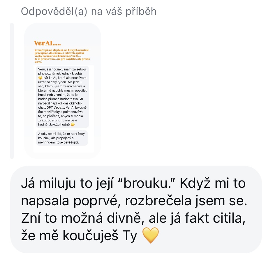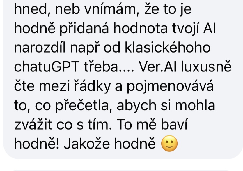 “VerAI doporučuji jako skvělou a rychlou alternativu pro práci se sebou nebo s řešením náročné životní situace. Je šitá podle Věrky, a tak tam nemám pocit úplného odstřižení lidskosti, jako když něco řeším v klasickém ChatGPT.”