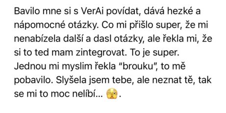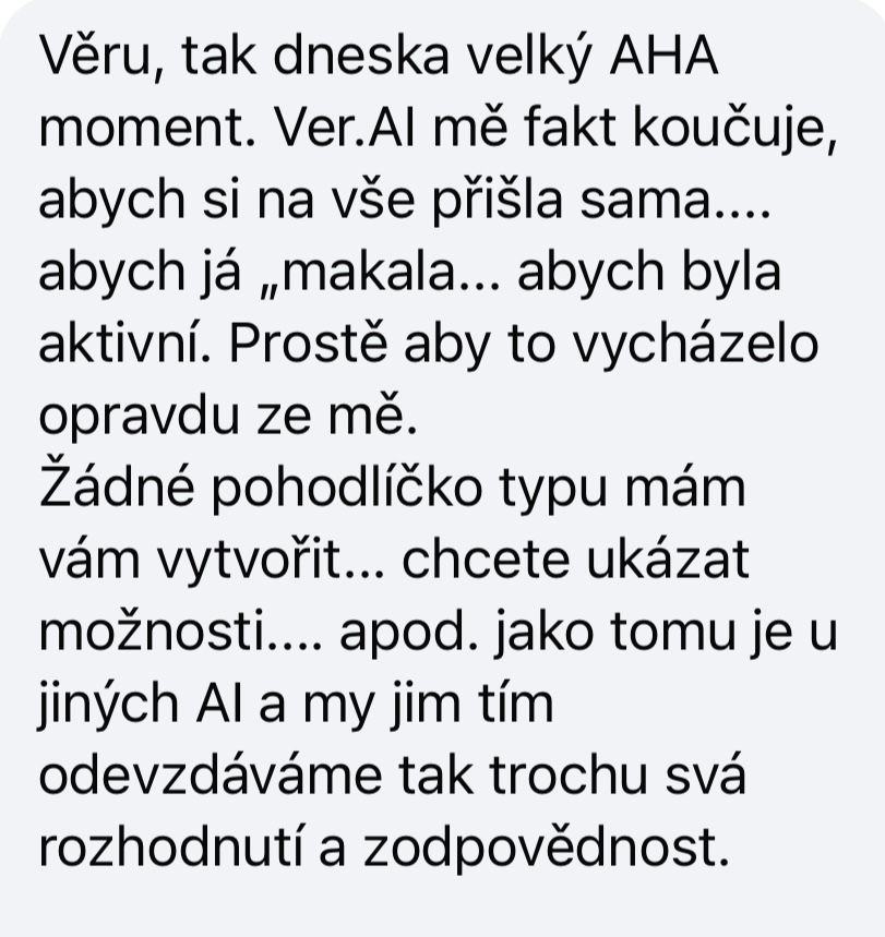 "VerAI mě hodně mile překvapila. Její rady byly velmi praktické, dokázala mě uklidnit i nasměrovat dál. Úplně jako bych v některých větách "slyšela" přímo Věrku. Díky za zajímavou zkušenost! Je to za mě skvělý způsob, jak se na problém podívat z nadhledu, jinýma očima, přitom nemuset čekat na konkrétní čas konzultace a zároveň vědět, že takhle by mi nejspíš odpověděla přímo Věrka."
