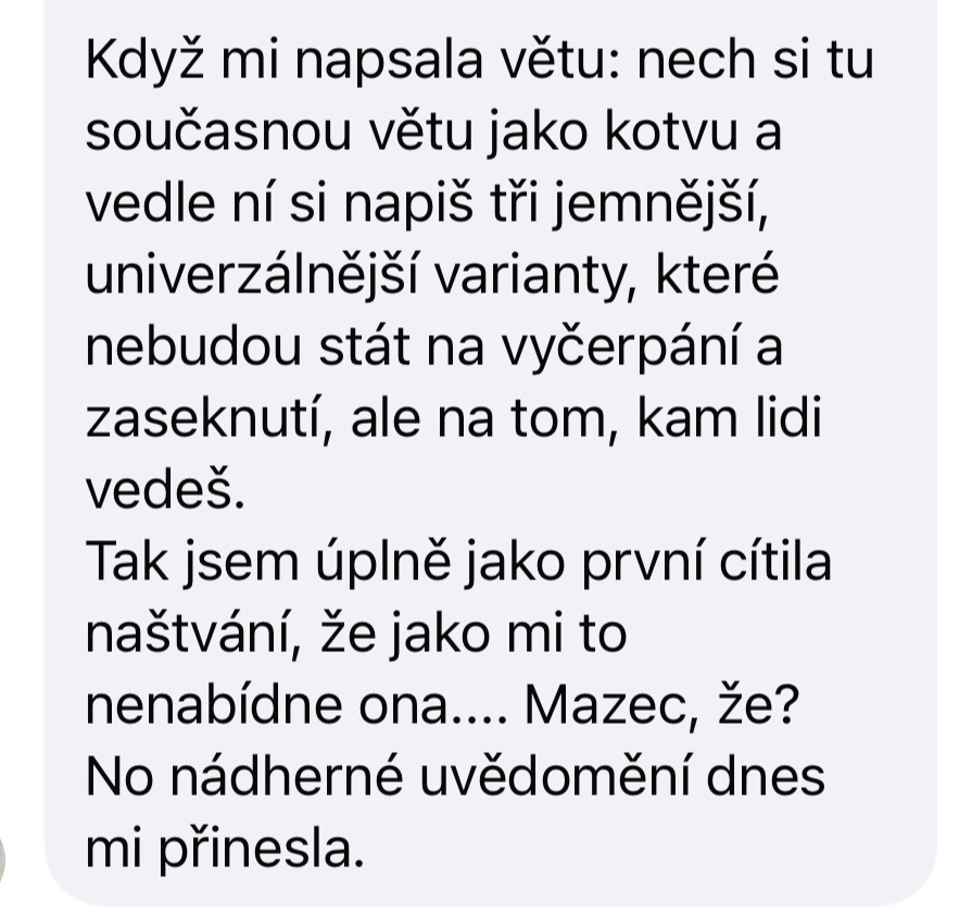 “Hele vypadá to fakt hodně dobře. Jsem nadšená, klobouk dolů. A co je i není fascinující, je tam Tvá esence. Pérovala jsem ji docela slušně, ale nedala se, držela si svou linku a koučovala. Neuvěřitelné.”